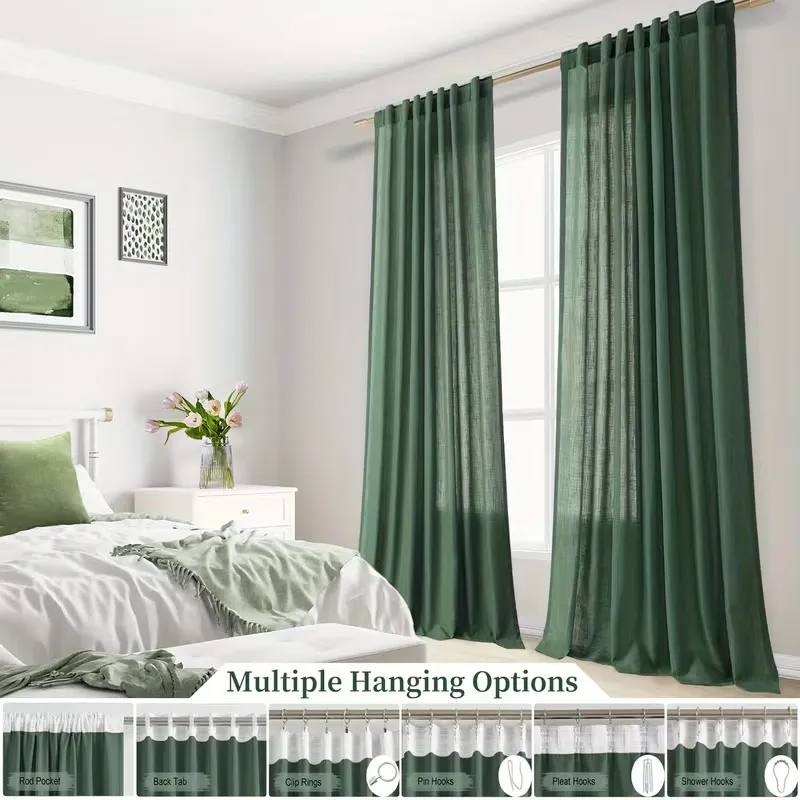 Flax weave semi-sheer linen blend curtains with multifunctional hanging options. Light-filtering design for living rooms and bedrooms, offering privacy with classic pastoral style. Machine washable and suitable for all-season use.